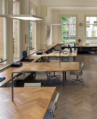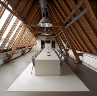 Carbon Studio, in collaboration with Kuub Architects has transformed the 1,000 m2 of the former Utrecht courthouse dating from 1912 in six months in order to install House Of Performance, a management consultancy, there. The original elements contrast with clever touches of humour and modernity. Thus the use of wood flooring under staff’s feet, as well as under their laptops. Another example: the former courtroom, which lost its solemn character when its chevron wood floor was updated with a grey coating. There is chevron wood on the office floors as well, and on the solid wood meeting tables, protected by an ultra-brilliant epoxy resin. House Of Performance’s 50 consultants, working four days out of five outside the office, only return to the premises at the end of the week. KUUB forestalled the impersonal atmosphere of quiet days with a "dynamic furniture" concept, furniture which by its shape, occupies the space in the highceilinged rooms without for all that detracting from the feeling of comfort when the premises are occupied by all the staff. Discrete glass partitions structure the space so that staff can isolate themselves in small groups by closing a door, the solid aspect of which symbolizes a guarantee of the confidentiality of the subjects being dealt with. On the 4th floor, invited to lunch under the eaves in a dining room where the floor and tables are also covered in chevron wood, customers and prospective customers enjoy a panoramic view of the city framed by large picture windows.