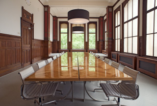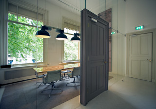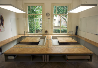 Carbon Studio, in collaboration with Kuub Architects has transformed the 1,000 m2 of the former Utrecht courthouse dating from 1912 in six months in order to install House Of Performance, a management consultancy, there. The original elements contrast with clever touches of humour and modernity. Thus the use of wood flooring under staff’s feet, as well as under their laptops. Another example: the former courtroom, which lost its solemn character when its chevron wood floor was updated with a grey coating. There is chevron wood on the office floors as well, and on the solid wood meeting tables, protected by an ultra-brilliant epoxy resin. House Of Performance’s 50 consultants, working four days out of five outside the office, only return to the premises at the end of the week. KUUB forestalled the impersonal atmosphere of quiet days with a "dynamic furniture" concept, furniture which by its shape, occupies the space in the highceilinged rooms without for all that detracting from the feeling of comfort when the premises are occupied by all the staff. Discrete glass partitions structure the space so that staff can isolate themselves in small groups by closing a door, the solid aspect of which symbolizes a guarantee of the confidentiality of the subjects being dealt with. On the 4th floor, invited to lunch under the eaves in a dining room where the floor and tables are also covered in chevron wood, customers and prospective customers enjoy a panoramic view of the city framed by large picture windows.
